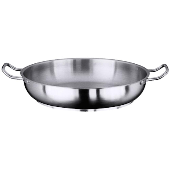 aus Edelstahl 18/10, matt poliert, mit zwei seitlichen Kaltgriffen und Schüttrand, 7 mm Sandwichboden, induktionsgeeignet (bis Ø 40 cm), schwere Qualität