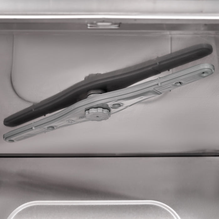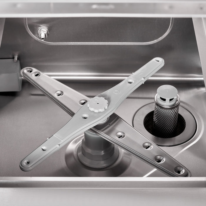 Die leistungsstarken 3 Wascharme garantieren eine gründliche Reinigung. Der untere Wasch- und Spülarm sowie der obere Spülarm arbeiten effizient zusammen, um selbst hartnäckigen Schmutz zu beseitigen. Mit einer maximalen Einschubhöhe von 300 mm und der Korbgröße von 400x400 mm eignet sich die Maschine ideal für Gläser, Bestecke und kleine Teller. Der universelle Korb und der Besteckköcher sind im Lieferumfang enthalten, was Ihnen zusätzliche Flexibilität bei der Nutzung bietet.